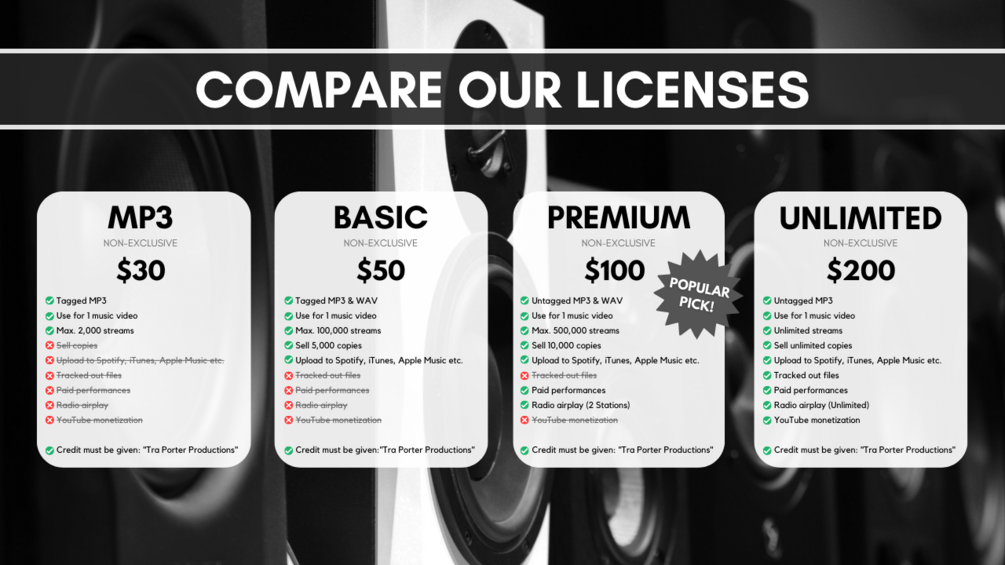 Whether you're seeking the perfect rhythm for your next song, video, podcast, or artistic endeavor, our diverse selection ensures there's a license that's just right for you.